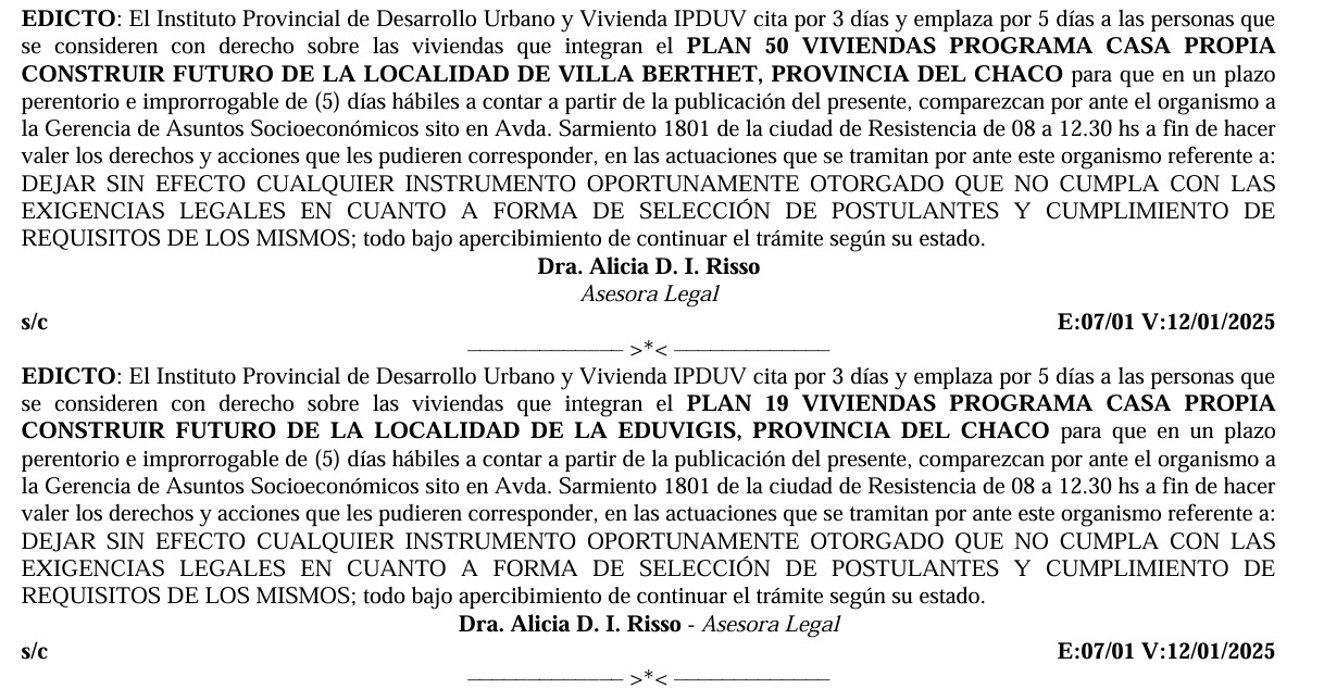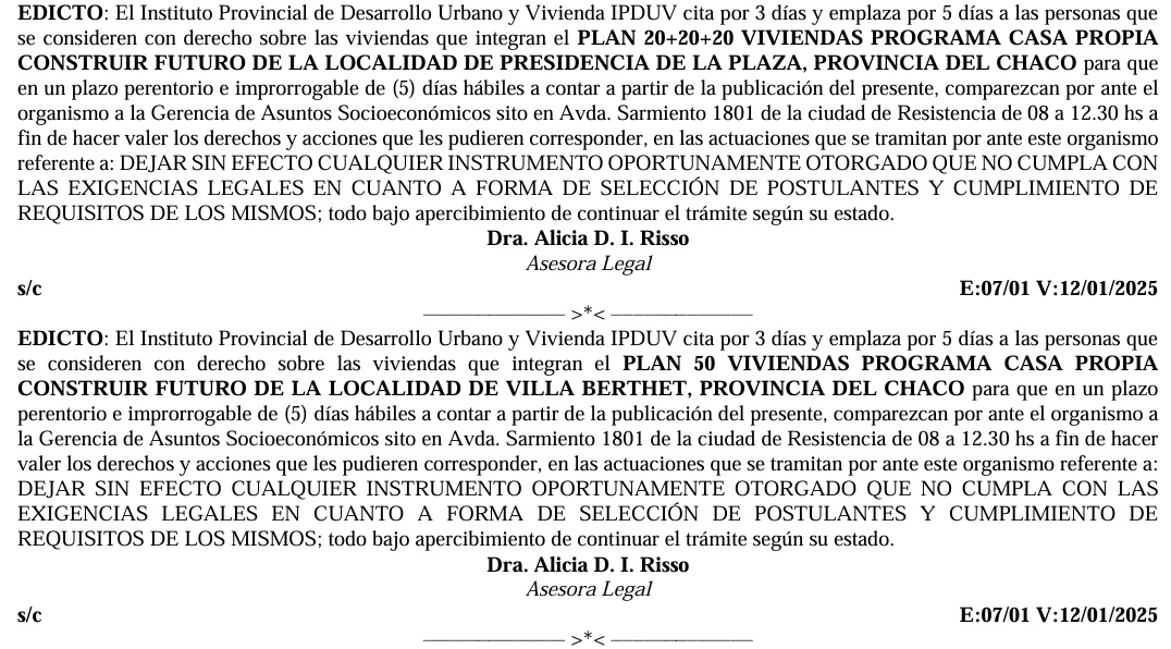 Pese a ello, el 7 de enero de 2026, en pleno receso administrativo, el IPDUV publicó edictos en el Boletín Oficial notificando a 356 titulares y preadjudicatarios de viviendas de distintas localidades chaqueñas. El objetivo declarado de estas actuaciones es dejar sin efecto adjudicaciones previamente otorgadas, bajo la amenaza de continuar los trámites “según su estado”, una fórmula vaga que encubre un avasallamiento directo de derechos adquiridos.